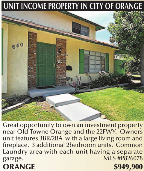 UNIT INCOME PROPERTY IN CITY OF ORANGE Great opportunity to own an investment property near Old Towne Orange and the 22FWY. Owners unit features 3BR/2BA with a large living room and fireplace. 3 additional 2bedroom units. Common Laundry area with each unit having a separate garage. MLS #P826078 ORANGE $949,900