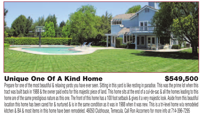 Unique One Of A Kind Home $549,500 Prepare for one of the most beautiful & relaxing yards you have ever seen. Sitting in this yard is like resting in paradise. This was the prime lot when this tract was built back in 1988 & the owner paid extra for this majestic piece of land. This home sits at the end of a cul-de-sac & all the homes leading to this home are of the same prestigious nature as this one. The front of this home has a 100 foot setback & gives it a very majestic look. Aside from this beautiful location this home has been cared for & nurtured & is in the same condition as it was in 1988 when it was new. This is a tri-level home w/a remodeled kitchen & BA & most items in this home have been remodeled. 46050 Clubhouse, Temecula. Call Ron Accornero for more info at 714-396-7295