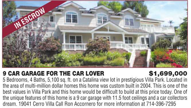 9 CAR GARAGE FOR THE CAR LOVER $1,699,000 5 Bedrooms, 4 Baths, 5,100 sq. ft. on a Catalina view lot in prestigious Villa Park. Located in the area of multi-million dollar homes this home was custom built in 2004. This is one of the best values in Villa Park and this home would be diffi cult to build at this price today. One of the unique features of this home is a 9 car garage with 11.5 foot ceilings and a car collectors dream. 19041 Cerro Villa Call Ron Accornero for more information at 714-396-7295