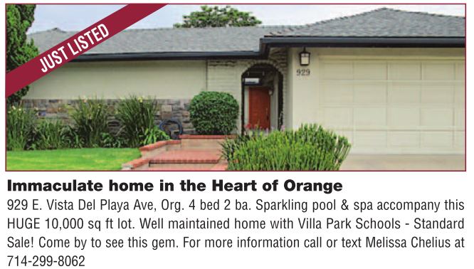 Immaculate home in the Heart of Orange 929 E. Vista Del Playa Ave, Org. 4 bed 2 ba. Sparkling pool & spa accompany this HUGE 10,000 sq ft lot. Well maintained home with Villa Park Schools - Standard Sale! Come by to see this gem. For more information call or text Melissa Chelius at 714-299-8062