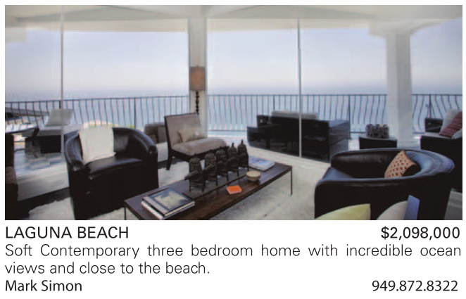 LAGUNA BEACH $2,098,000 Soft Contemporary three bedroom home with incredible ocean views and close to the beach. Mark Simon 949.872.8322