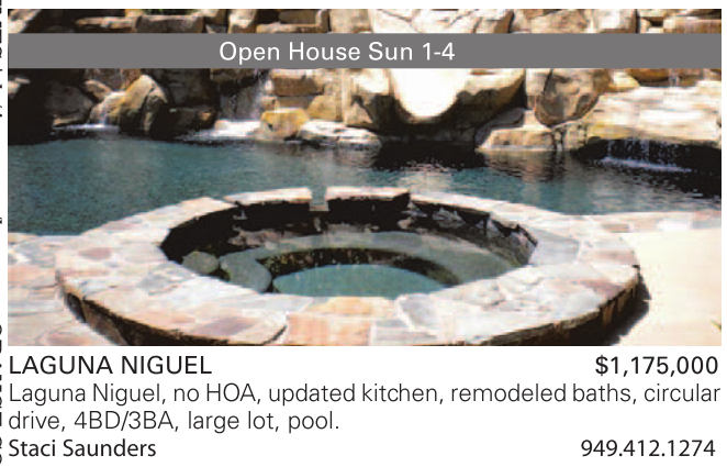 LAGUNA NIGUEL $1,175,000 Laguna Niguel, no HOA, updated kitchen, remodeled baths, circular drive, 4BD/3BA, large lot, pool. Staci Saunders 949.412.1274