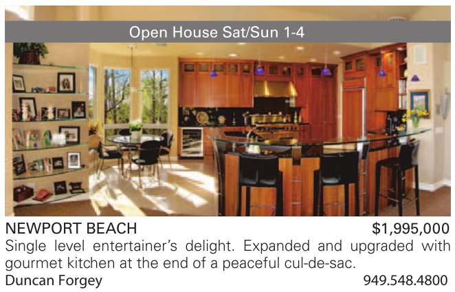 NEWPORT BEACH $1,995,000 Single level entertainer’s delight. Expanded and upgraded with gourmet kitchen at the end of a peaceful cul-de-sac. Duncan Forgey 949.548.4800