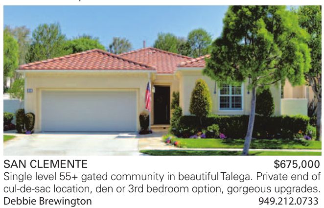 SAN CLEMENTE $675,000 Single level 55+ gated community in beautiful Talega. Private end of cul-de-sac location, den or 3rd bedroom option, gorgeous upgrades. Debbie Brewington 949.212.0733