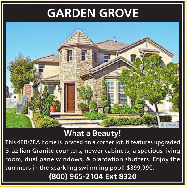 GARDEN GROVE What a Beauty! This 4BR/2BA home is located on a corner lot. It features upgraded Brazilian Granite counters, newer cabinets, a spacious living room, dual pane windows, & plantation shutters. Enjoy the summers in the sparkling swimming pool! $399,990. (800) 965-2104 Ext 8320 See also