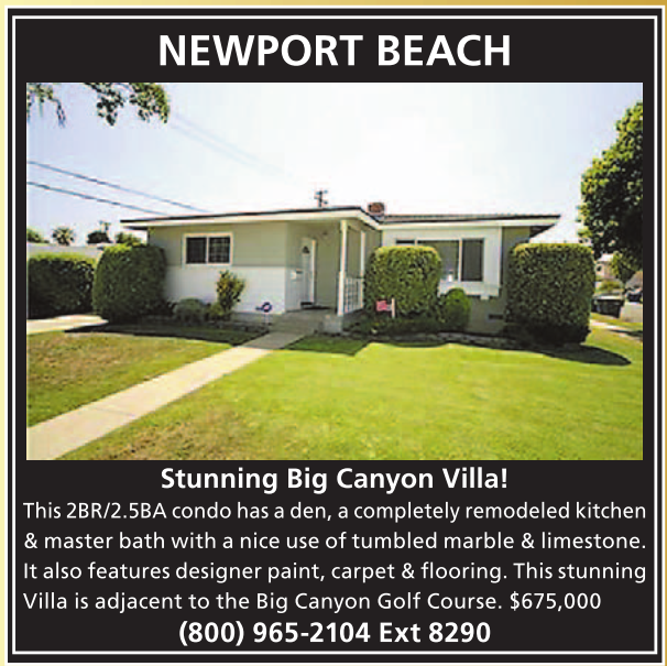 NEWPORT BEACH Stunning Big Canyon Villa! This 2BR/2.5BA condo has a den, a completely remodeled kitchen & master bath with a nice use of tumbled marble & limestone. It also features designer paint, carpet & flooring. This stunning Villa is adjacent to the Big Canyon Golf Course. $675,000 (800) 965-2104 Ext 8290