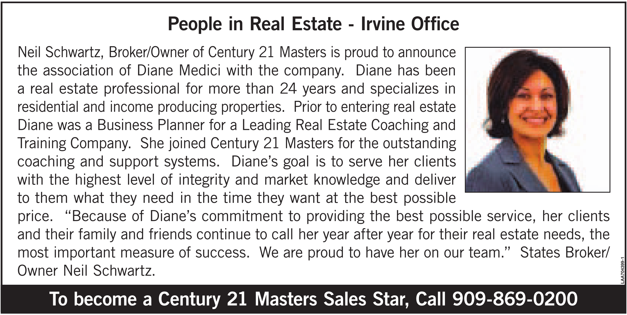 People in Real Estate - Irvine Office Neil Schwartz, Broker/Owner of Century 21 Masters is proud to announce the association of Diane Medici with the company. Diane has been a real estate professional for more than 24 years and specializes in residential and income producing properties. Prior to entering real estate Diane was a Business Planner for a Leading Real Estate Coaching and Training Company. She joined Century 21 Masters for the outstanding coaching and support systems. Diane’s goal is to serve her clients with the highest level of integrity and market knowledge and deliver to them what they need in the time they want at the best possible price. “Because of Diane’s commitment to providing the best possible service, her clients and their family and friends continue to call her year after year for their real estate needs, the most important measure of success. We are proud to have her on our team.” States Broker/ Owner Neil Schwartz. To become a Century 21 Masters Sales Star, Call 909-869-0200