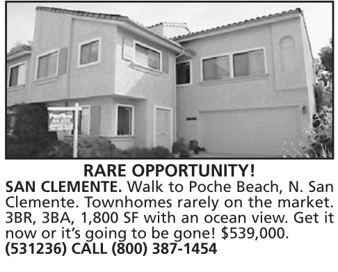 SAN CLEMENTE. Walk to Poche Beach, N. San Clemente. Townhomes rarely on the market. 3BR, 3BA, 1,800 SF with an ocean view. Get it now or it’s going to be gone! $539,000. (531236) CALL (800) 387-1454