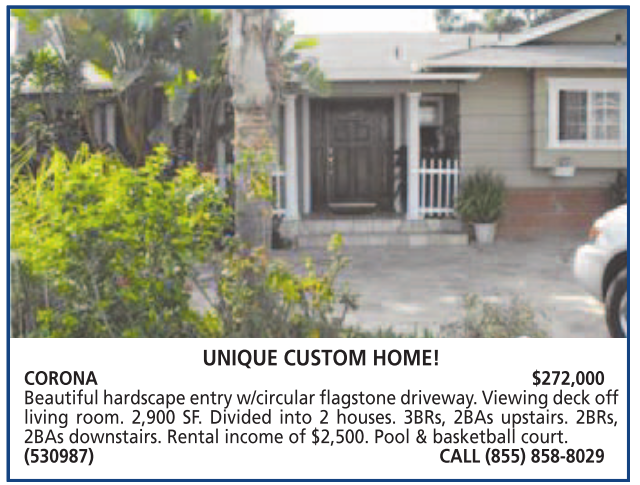 UNIQUE CUSTOM HOME! CORONA $272,000 Beautiful hardscape entry w/circular flagstone driveway. Viewing deck off living room. 2,900 SF. Divided into 2 houses. 3BRs, 2BAs upstairs. 2BRs, 2BAs downstairs. Rental income of $2,500. Pool & basketball court. (530987) CALL (855) 858-8029