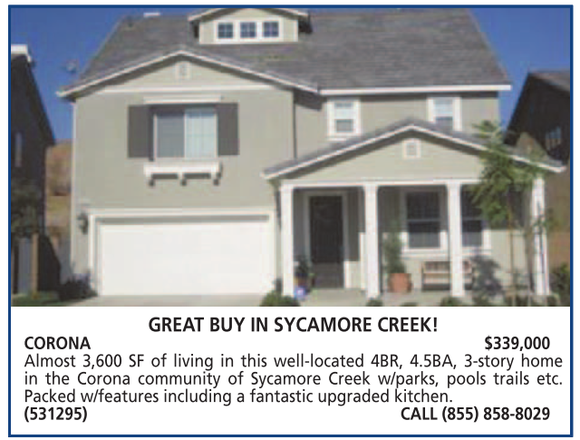 GREAT BUY IN SYCAMORE CREEK! CORONA $339,000 Almost 3,600 SF of living in this well-located 4BR, 4.5BA, 3-story home in the Corona community of Sycamore Creek w/parks, pools trails etc. Packed w/features including a fantastic upgraded kitchen. (531295) CALL (855) 858-8029