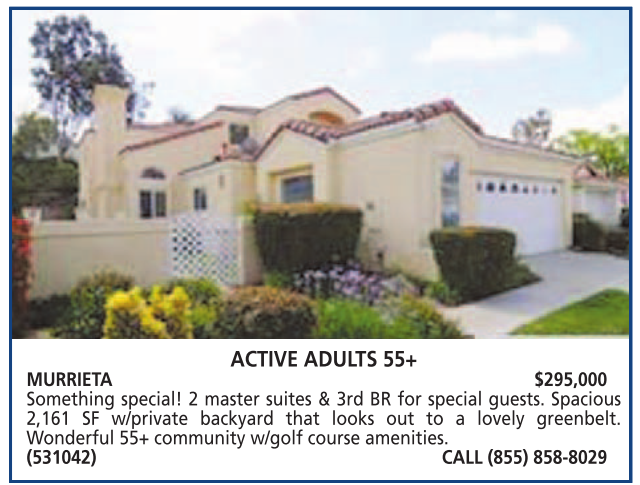 ACTIVE ADULTS 55+ MURRIETA $295,000 Something special! 2 master suites & 3rd BR for special guests. Spacious 2,161 SF w/private backyard that looks out to a lovely greenbelt. Wonderful 55+ community w/golf course amenities. (531042) CALL (855) 858-8029