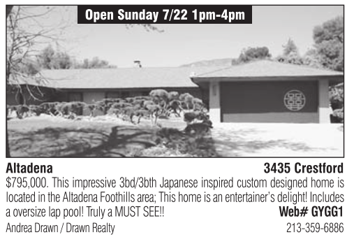 Open Sunday 7/22 1pm-4pm Andrea Drawn / Drawn Realty 213-359-6886 Altadena 3435 Crestford $795,000. This impressive 3bd/3bth Japanese inspired custom designed home is located in the Altadena Foothills area; This home is an entertainer’s delight! Includes a oversize lap pool! Truly a MUST SEE!! Web# GYGG1
