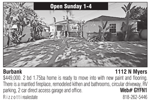 Open Sunday 1-4 Burbank 1112 N Myers $449,000. 2 bd 1.75ba home is ready to move into with new paint and flooring. There is a mantled fireplace, remodeled kithen and bathrooms, circular driveway, RV parking, 2 car direct access garage and office. Web# GYFN1 R i z z o t t i realestate 818-262-5446 See also