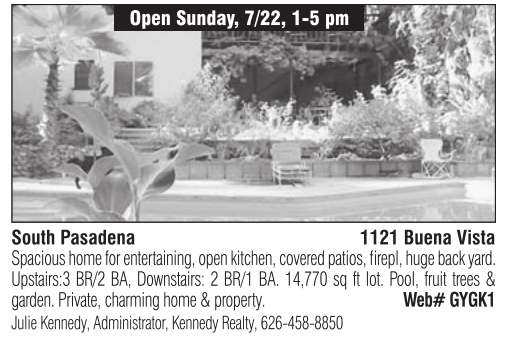 Open Sunday, 7/22, 1-5 pm South Pasadena 1121 Buena Vista Spacious home for entertaining, open kitchen, covered patios, firepl, huge back yard. Upstairs:3 BR/2 BA, Downstairs: 2 BR/1 BA. 14,770 sq ft lot. Pool, fruit trees & garden. Private, charming home & property. Web# GYGK1 Julie Kennedy, Administrator, Kennedy Realty, 626-458-8850