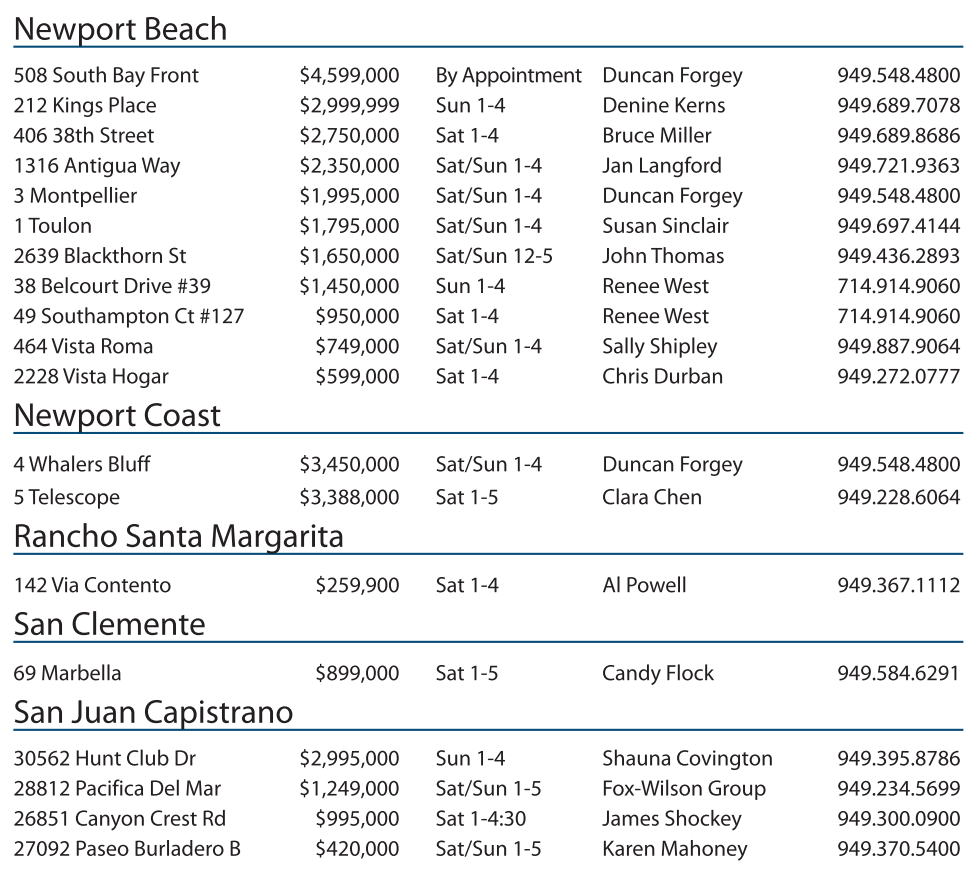 4 Whalers Bluff $3,450,000 Sat/Sun 1-4 Duncan Forgey 949.548.4800 5 Telescope $3,388,000 Sat 1-5 Clara Chen 949.228.6064