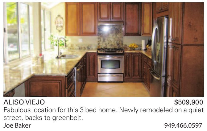 ALISO VIEJO $509,900 Fabulous location for this 3 bed home. Newly remodeled on a quiet street, backs to greenbelt. Joe Baker 949.466.0597