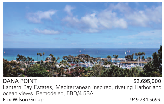 DANA POINT $2,695,000 Lantern Bay Estates, Mediterranean inspired, riveting Harbor and ocean views. Remodeled, 5BD/4.5BA. Fox-Wilson Group 949.234.5699