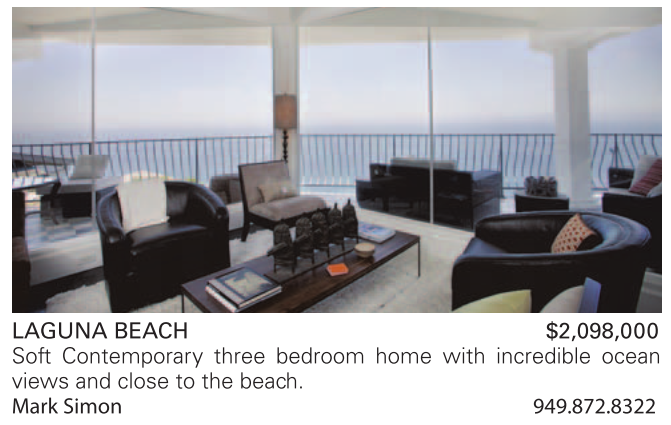 LAGUNA BEACH $2,098,000 Soft Contemporary three bedroom home with incredible ocean views and close to the beach. Mark Simon 949.872.8322