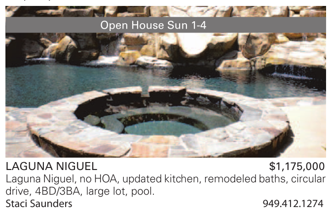LAGUNA NIGUEL $1,175,000 Laguna Niguel, no HOA, updated kitchen, remodeled baths, circular drive, 4BD/3BA, large lot, pool. Staci Saunders 949.412.1274