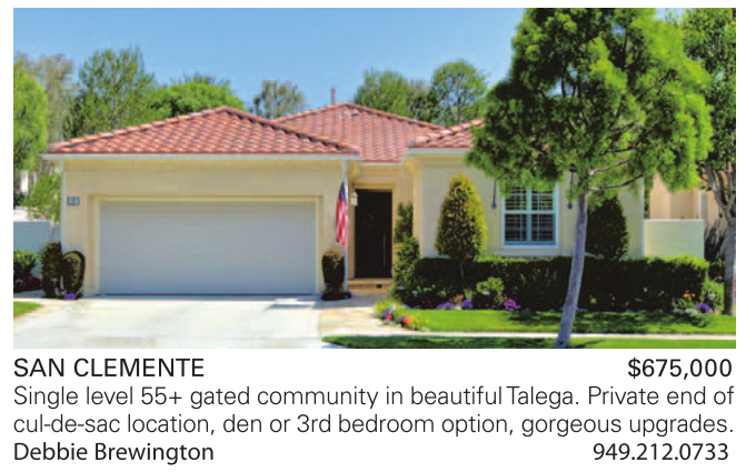 SAN CLEMENTE $675,000 Single level 55+ gated community in beautiful Talega. Private end of cul-de-sac location, den or 3rd bedroom option, gorgeous upgrades. Debbie Brewington 949.212.0733