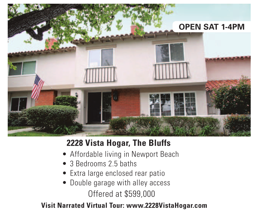 2228 Vista Hogar, The Bluffs • Affordable living in Newport Beach • 3 Bedrooms 2.5 baths • Extra large enclosed rear patio • Double garage with alley access Offered at $599,000 Visit Narrated Virtual Tour: www.2228VistaHogar.com