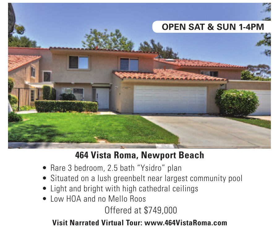 464 Vista Roma, Newport Beach • Rare 3 bedroom, 2.5 bath “Ysidro” plan • Situated on a lush greenbelt near largest community pool • Light and bright with high cathedral ceilings • Low HOA and no Mello Roos Offered at $749,000 Visit Narrated Virtual Tour: www.464VistaRoma.com