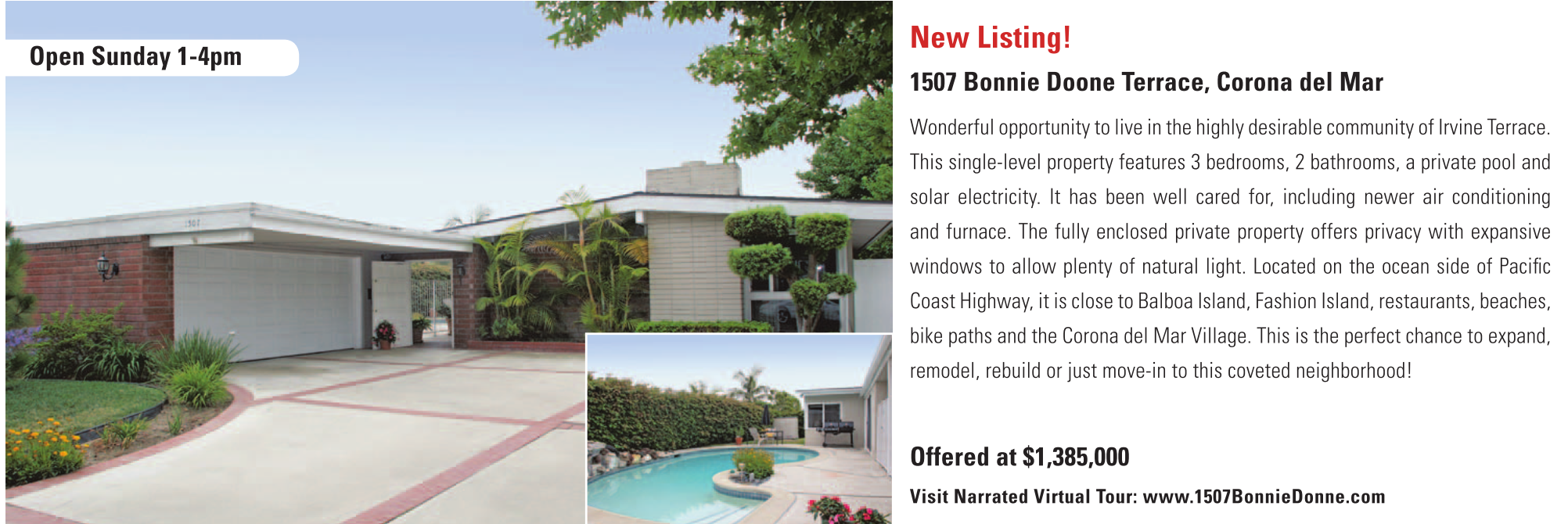 Open Sunday 1-4pm New Listing! 1507 Bonnie Doone Terrace, Corona del Mar Wonderful opportunity to live in the highly desirable community of Irvine Terrace. This single-level property features 3 bedrooms, 2 bathrooms, a private pool and solar electricity. It has been well cared for, including newer air conditioning and furnace. The fully enclosed private property offers privacy with expansive windows to allow plenty of natural light. Located on the ocean side of Pacific Coast Highway, it is close to Balboa Island, Fashion Island, restaurants, beaches, bike paths and the Corona del Mar Village. This is the perfect chance to expand, remodel, rebuild or just move-in to this coveted neighborhood! Offered at $1,385,000 Visit Narrated Virtual Tour: www.1507BonnieDonne.com