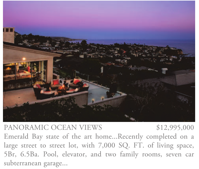 PANORAMIC OCEAN VIEWS $12,995,000 Emerald Bay state of the art home...Recently completed on a large street to street lot, with 7,000 SQ. FT. of living space, 5Br, 6.5Ba. Pool, elevator, and two family rooms, seven car subterranean garage...