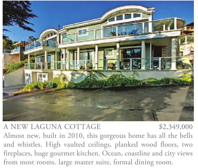 A NEW LAGUNA COTTAGE $2,349,000 Almost new, built in 2010, this gorgeous home has all the bells and whistles. High vaulted ceilings, planked wood floors, two fireplaces, huge gourmet kitchen. Ocean, coastline and city views from most rooms. large master suite, formal dining room.