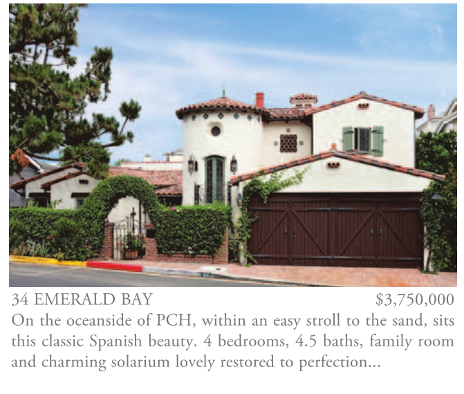 34 EMERALD BAY $3,750,000 On the oceanside of PCH, within an easy stroll to the sand, sits this classic Spanish beauty. 4 bedrooms, 4.5 baths, family room and charming solarium lovely restored to perfection...