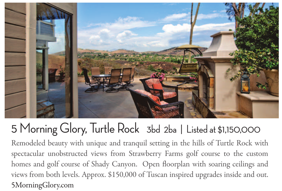 Remodeled beauty with unique and tranquil setting in the hills of Turtle Rock with spectacular unobstructed views from Strawberry Farms golf course to the custom homes and golf course of Shady Canyon. Open floorplan with soaring ceilings and views from both levels. Approx. $150,000 of Tuscan inspired upgrades inside and out. 5MorningGlory.com