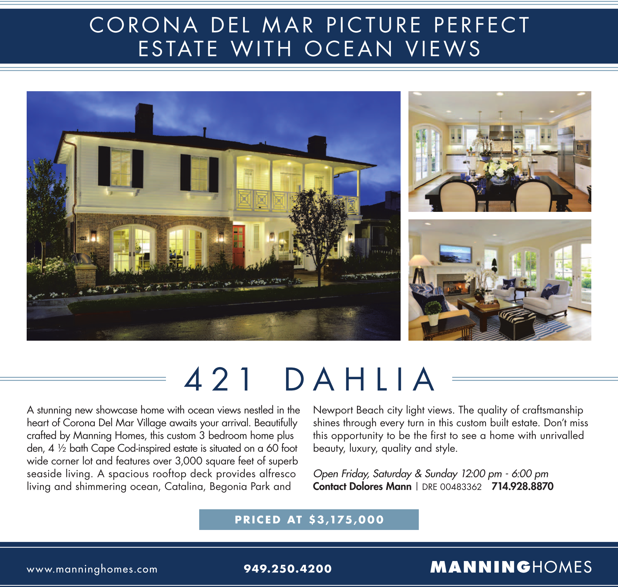 A stunning new showcase home with ocean views nestled in the heart of Corona Del Mar Village awaits your arrival. Beautifully crafted by Manning Homes, this custom 3 bedroom home plus den, 4 ½ bath Cape Cod-inspired estate is situated on a 60 foot wide corner lot and features over 3,000 square feet of superb seaside living. A spacious rooftop deck provides alfresco living and shimmering ocean, Catalina, Begonia Park and