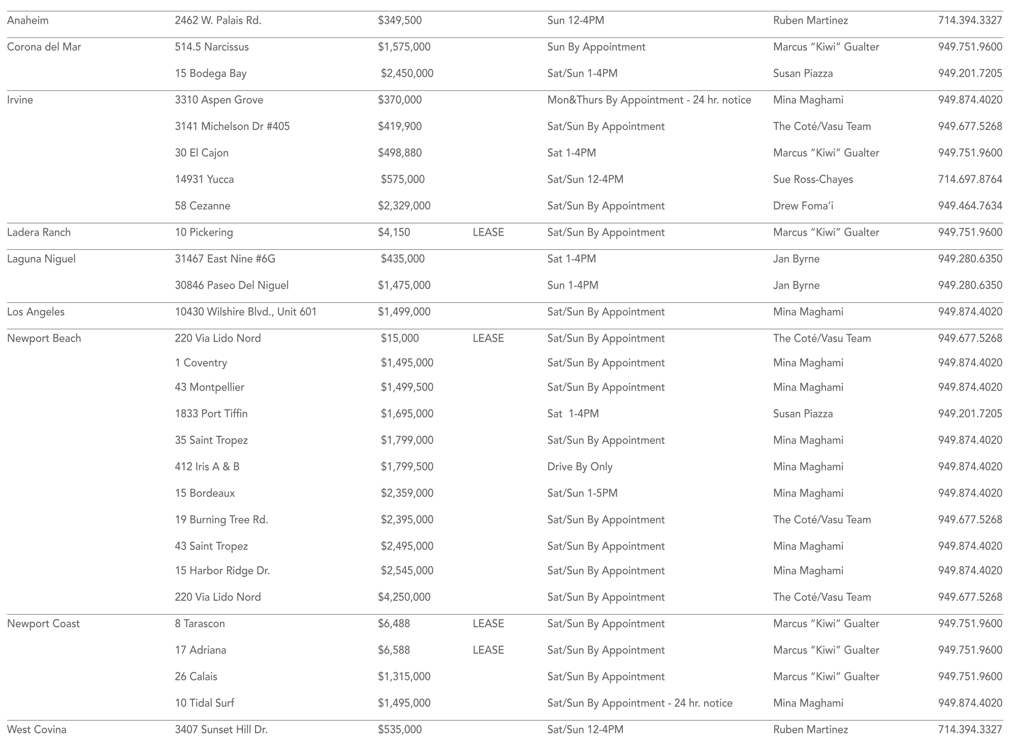 30 El Cajon $498,880 Sat 1-4PM Marcus “Kiwi” Gualter 949.751.9600 14931 Yucca $575,000 Sat/Sun 12-4PM Sue Ross-Chayes 714.697.8764 58 Cezanne $2,329,000 Sat/Sun By Appointment Drew Foma’i 949.464.7634 Ladera Ranch 10 Pickering $4,150 LEASE Sat/Sun By Appointment Marcus “Kiwi” Gualter 949.751.9600 Laguna Niguel 31467 East Nine #6G $435,000 Sat 1-4PM Jan Byrne 949.280.6350 30846 Paseo Del Niguel $1,475,000 Sun 1-4PM Jan Byrne 949.280.6350 Los Angeles 10430 Wilshire Blvd., Unit 601 $1,499,000 Sat/Sun By Appointment Mina Maghami 949.874.4020 Newport Beach 220 Via Lido Nord $15,000 LEASE Sat/Sun By Appointment The Coté/Vasu Team 949.677.5268 1 Coventry $1,495,000 Sat/Sun By Appointment Mina Maghami 949.874.4020 43 Montpellier $1,499,500 Sat/Sun By Appointment Mina Maghami 949.874.4020 1833 Port Tiffin $1,695,000 Sat 1-4PM Susan Piazza 949.201.7205 35 Saint Tropez $1,799,000 Sat/Sun By Appointment Mina Maghami 949.874.4020 412 Iris A & B $1,799,500 Drive By Only Mina Maghami 949.874.4020 15 Bordeaux $2,359,000 Sat/Sun 1-5PM Mina Maghami 949.874.4020 19 Burning Tree Rd. $2,395,000 Sat/Sun By Appointment The Coté/Vasu Team 949.677.5268 43 Saint Tropez $2,495,000 Sat/Sun By Appointment Mina Maghami 949.874.4020 15 Harbor Ridge Dr. $2,545,000 Sat/Sun By Appointment Mina Maghami 949.874.4020 220 Via Lido Nord $4,250,000 Sat/Sun By Appointment The Coté/Vasu Team 949.677.5268 Newport Coast 8 Tarascon $6,488 LEASE Sat/Sun By Appointment Marcus “Kiwi” Gualter 949.751.9600 17 Adriana $6,588 LEASE Sat/Sun By Appointment Marcus “Kiwi” Gualter 949.751.9600 26 Calais $1,315,000 Sat/Sun By Appointment Marcus “Kiwi” Gualter 949.751.9600 10 Tidal Surf $1,495,000 Sat/Sun By Appointment - 24 hr. notice Mina Maghami 949.874.4020 West Covina 3407 Sunset Hill Dr. $535,000 Sat/Sun 12-4PM Ruben Martinez 714.394.3327