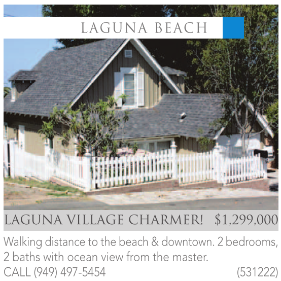 LAGUNA VILLAGE CHARMER! $1,299,000 Walking distance to the beach & downtown. 2 bedrooms, 2 baths with ocean view from the master. CALL (949) 497-5454 (531222)