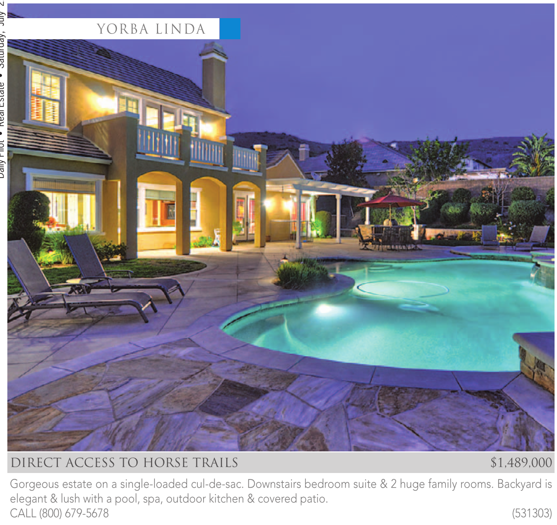 DIRECT ACCESS TO HORSE TRAILS $1,489,000 Gorgeous estate on a single-loaded cul-de-sac. Downstairs bedroom suite & 2 huge family rooms. Backyard is elegant & lush with a pool, spa, outdoor kitchen & covered patio. CALL (800) 679-5678 (531303)
