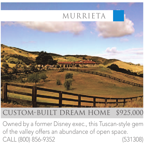 CUSTOM-BUILT DREAM HOME $925,000 Owned by a former Disney exec., this Tuscan-style gem of the valley offers an abundance of open space. CALL (800) 856-9352 (531308)