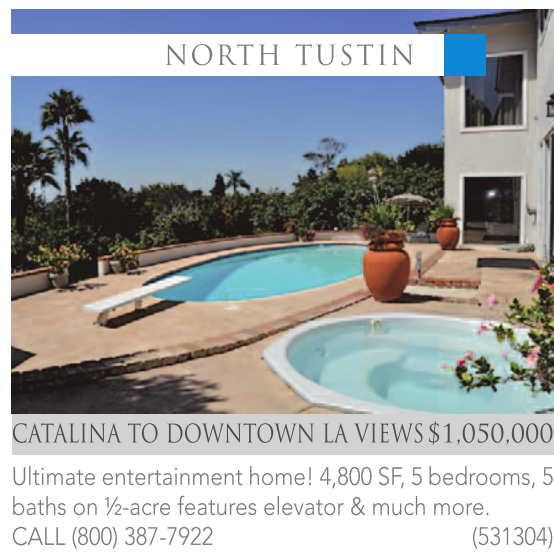 CATALINA TO DOWNTOWN LA VIEWS $1,050,000 Ultimate entertainment home! 4,800 SF, 5 bedrooms, 5 baths on ½-acre features elevator & much more. CALL (800) 387-7922 (531304)