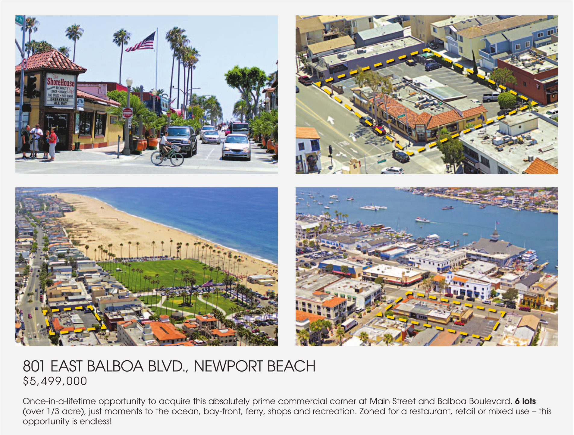 Once-in-a-lifetime opportunity to acquire this absolutely prime commercial corner at Main Street and Balboa Boulevard. 6 lots (over 1/3 acre), just moments to the ocean, bay-front, ferry, shops and recreation. Zoned for a restaurant, retail or mixed use – this opportunity is endless!