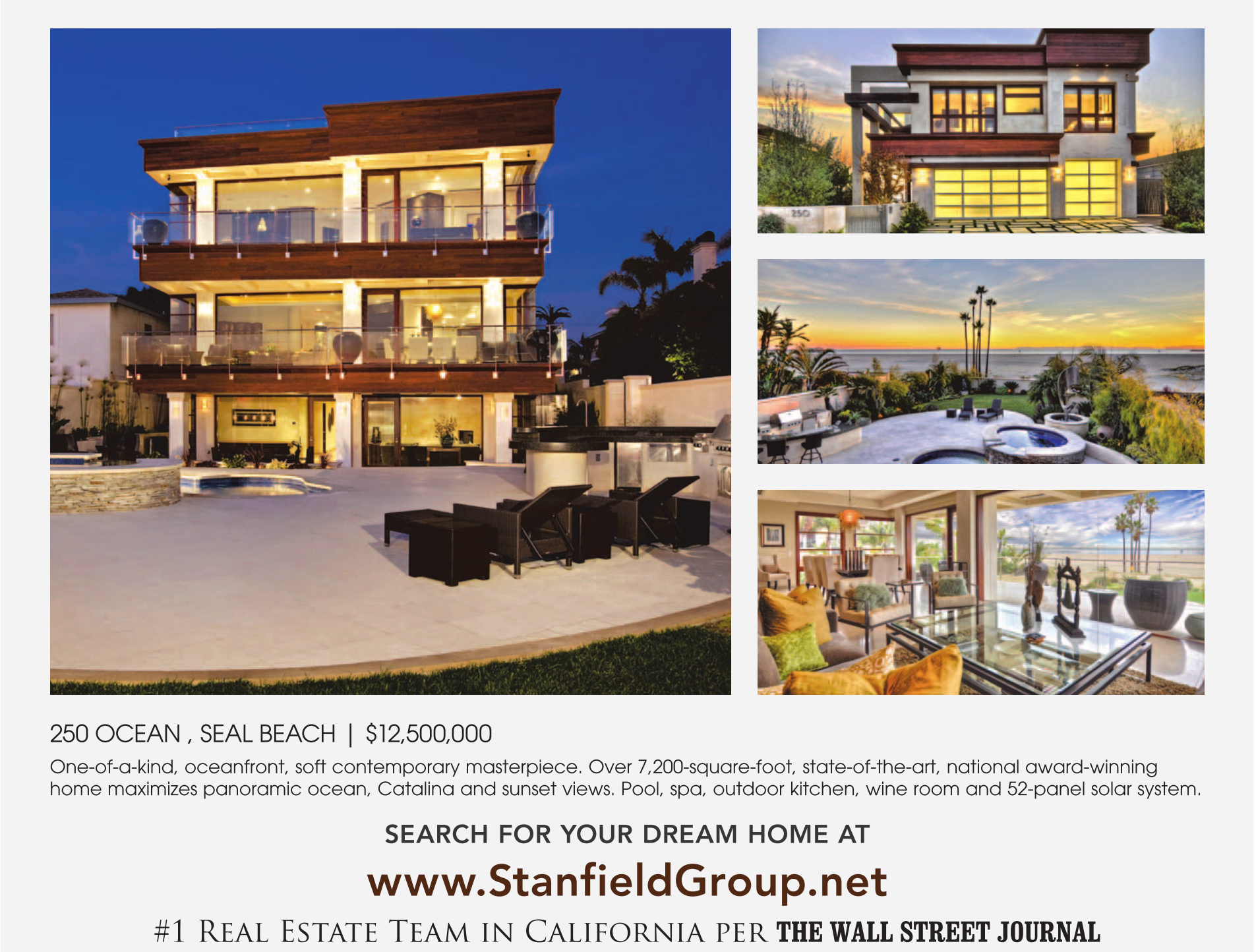 250 OCEAN , SEAL BEACH | $12,500,000 One-of-a-kind, oceanfront, soft contemporary masterpiece. Over 7,200-square-foot, state-of-the-art, national award-winning home maximizes panoramic ocean, Catalina and sunset views. Pool, spa, outdoor kitchen, wine room and 52-panel solar system. SEARCH FOR YOUR DREAM HOME AT #1 Real Estate Team in California per THE WALL STREET JOURNAL