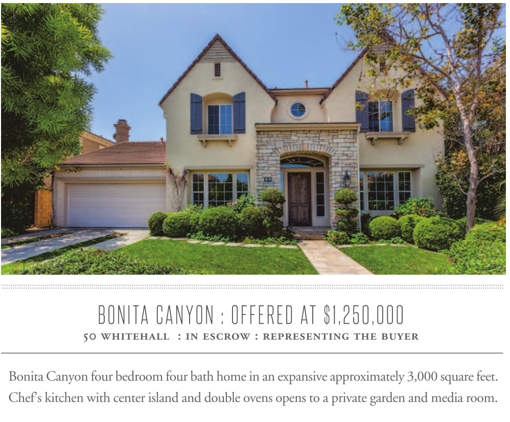 BONITA CANYON : OFFERED AT $1,250,000 50 whitehall : in escrow : representing the buyer Bonita Canyon four bedroom four bath home in an expansive approximately 3,000 square feet. Chef’s kitchen with center island and double ovens opens to a private garden and media room.