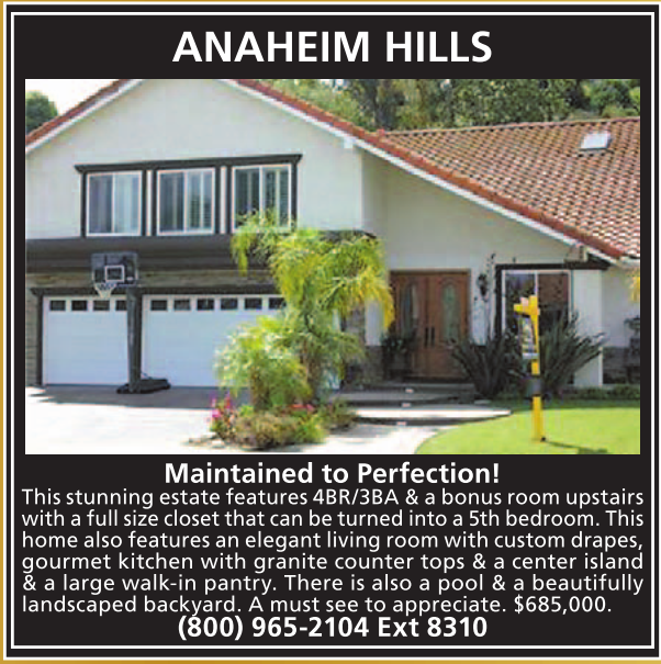 ANAHEIM HILLS Maintained to Perfection! This stunning estate features 4BR/3BA & a bonus room upstairs with a full size closet that can be turned into a 5th bedroom. This home also features an elegant living room with custom drapes, gourmet kitchen with granite counter tops & a center island & a large walk-in pantry. There is also a pool & a beautifully landscaped backyard. A must see to appreciate. $685,000. (800) 965-2104 Ext 8310