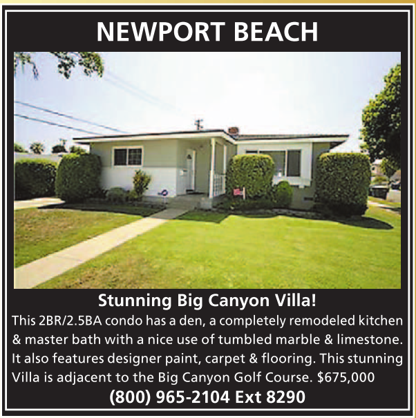 This 2BR/2.5BA condo has a den, a completely remodeled kitchen & master bath with a nice use of tumbled marble & limestone. It also features designer paint, carpet & flooring. This stunning Villa is adjacent to the Big Canyon Golf Course. $675,000 (800) 965-2104 Ext 8290
