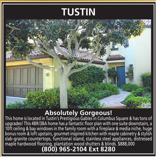 This home is located in Tustin’s Prestigious Gables in Columbus Square & has tons of upgrades! This 4BR/3BA home has a fantastic floor plan with one suite downstairs, a 10ft ceiling & bay windows in the family room with a fireplace & media niche, huge bonus room & loft upstairs, gourmet-inspired kitchen with maple cabinetry & stylish slab-granite countertops, functional island, stainless steel appliances, distressed maple hardwood flooring, plantation wood shutters & blinds. $888,000 (800) 965-2104 Ext 8280