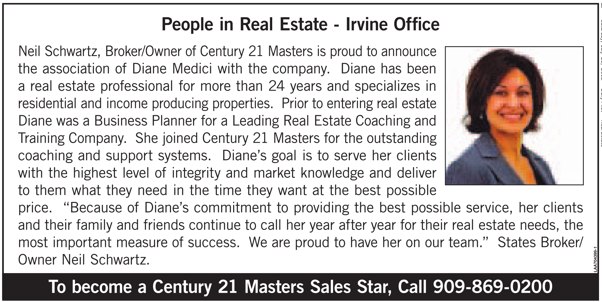 People in Real Estate - Irvine Office Neil Schwartz, Broker/Owner of Century 21 Masters is proud to announce the association of Diane Medici with the company. Diane has been a real estate professional for more than 24 years and specializes in residential and income producing properties. Prior to entering real estate Diane was a Business Planner for a Leading Real Estate Coaching and Training Company. She joined Century 21 Masters for the outstanding coaching and support systems. Diane’s goal is to serve her clients with the highest level of integrity and market knowledge and deliver to them what they need in the time they want at the best possible price. “Because of Diane’s commitment to providing the best possible service, her clients and their family and friends continue to call her year after year for their real estate needs, the most important measure of success. We are proud to have her on our team.” States Broker/ Owner Neil Schwartz. To become a Century 21 Masters Sales Star, Call 909-869-0200 53