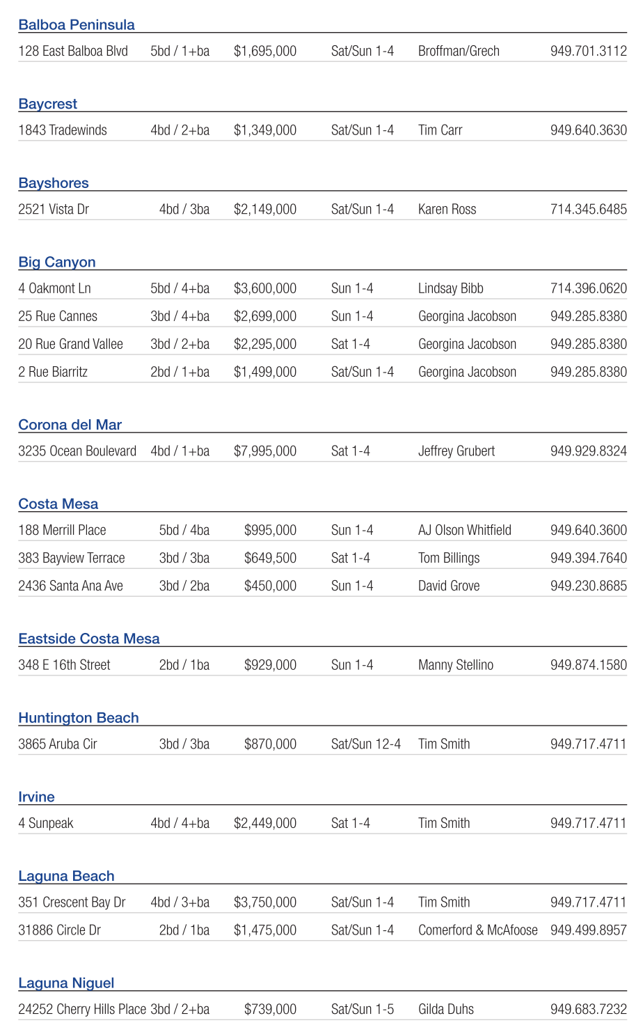 3235 Ocean Boulevard 4bd / 1+ba $7,995,000 Sat 1-4 Jeffrey Grubert 949.929.8324