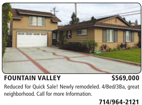 FOUNTAIN VALLEY $569,000 Reduced for Quick Sale! Newly remodeled. 4/Bed/3Ba, great neighborhood. Call for more Information.