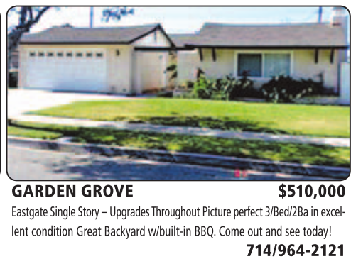 GARDEN GROVE $510,000 Eastgate Single Story – Upgrades Throughout Picture perfect 3/Bed/2Ba in excellent condition Great Backyard w/built-in BBQ. Come out and see today!
