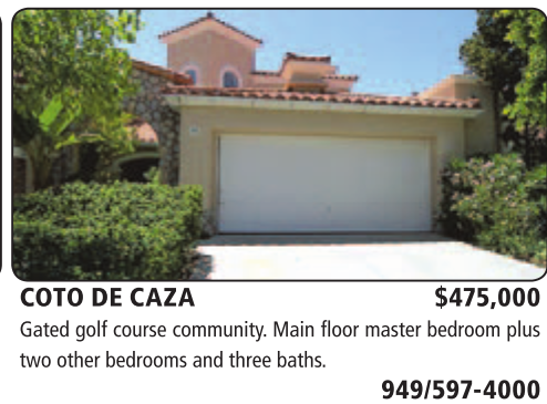 COTO DE CAZA $475,000 Gated golf course community. Main floor master bedroom plus two other bedrooms and three baths.
