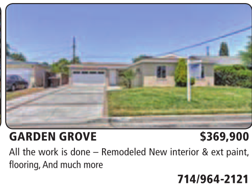 GARDEN GROVE $369,900 All the work is done – Remodeled New interior & ext paint, flooring, And much more 714/964-2121