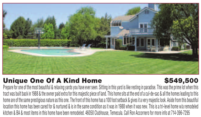 Unique One Of A Kind Home $549,500 Prepare for one of the most beautiful & relaxing yards you have ever seen. Sitting in this yard is like resting in paradise. This was the prime lot when this tract was built back in 1988 & the owner paid extra for this majestic piece of land. This home sits at the end of a cul-de-sac & all the homes leading to this home are of the same prestigious nature as this one. The front of this home has a 100 foot setback & gives it a very majestic look. Aside from this beautiful location this home has been cared for & nurtured & is in the same condition as it was in 1988 when it was new. This is a tri-level home w/a remodeled kitchen & BA & most items in this home have been remodeled. 46050 Clubhouse, Temecula. Call Ron Accornero for more info at 714-396-7295